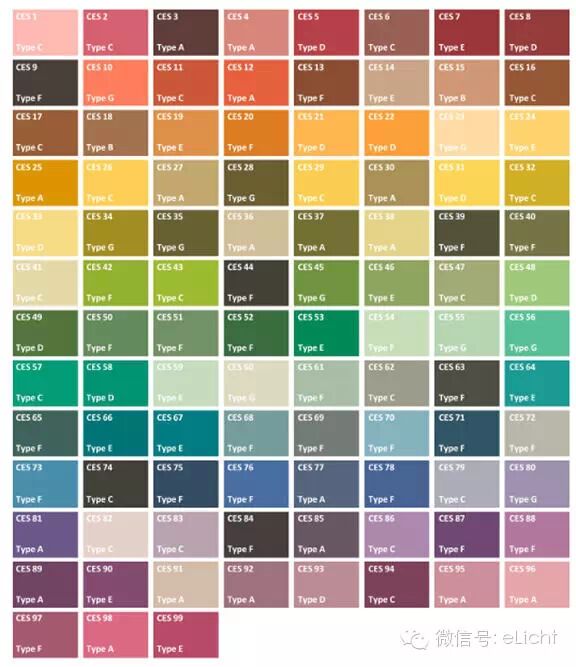 2、 标准色:与CRI仅有8个标准色相比,新的体系采用99个标准色。这99个标准色不再是梦塞尔色卡,而是从105000个物体的颜色中仔细选取的。它们代表了生活中能看到的常见各种颜色(从饱和到不饱和、从亮到暗),并且这99个标准色对于各波长的敏感度相同(很难通过spectral gaming来提高指数)。